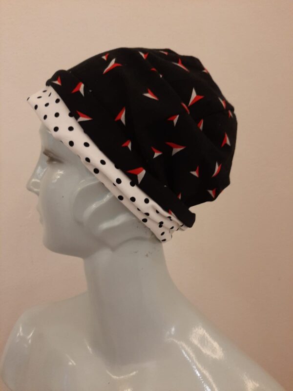 Deze muts heeft aan de binnenkant een andere print en is aan beide kanten te dragen